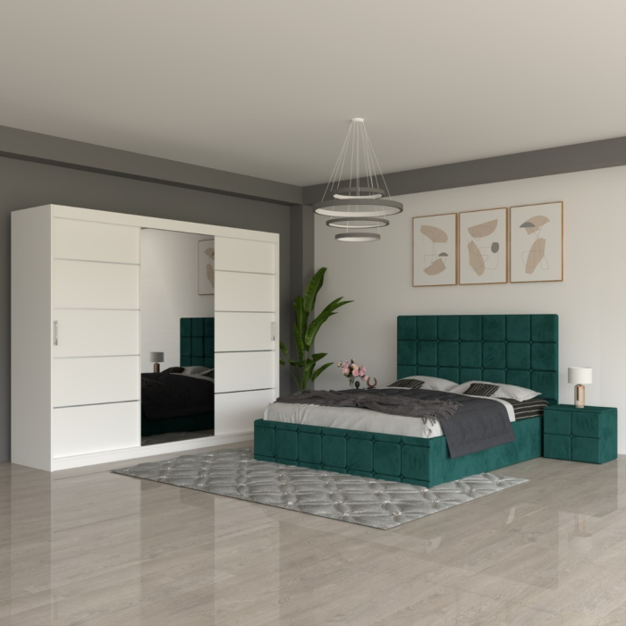 Set Mobila De Dormitor COD03 Alb/Verde, pat tapitat 160x200cm, dulap 250cm, 2 noptiere si saltea 160x200cm