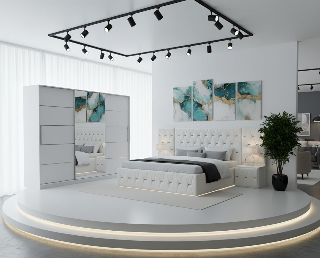 Set Mobila De Dormitor Eric Alb Cu Extensii, pat Eric cu extensii tapitat Alb 160x200cm, dulap Alb 250cm, 2 noptiere tapitate si saltea 160x200cm