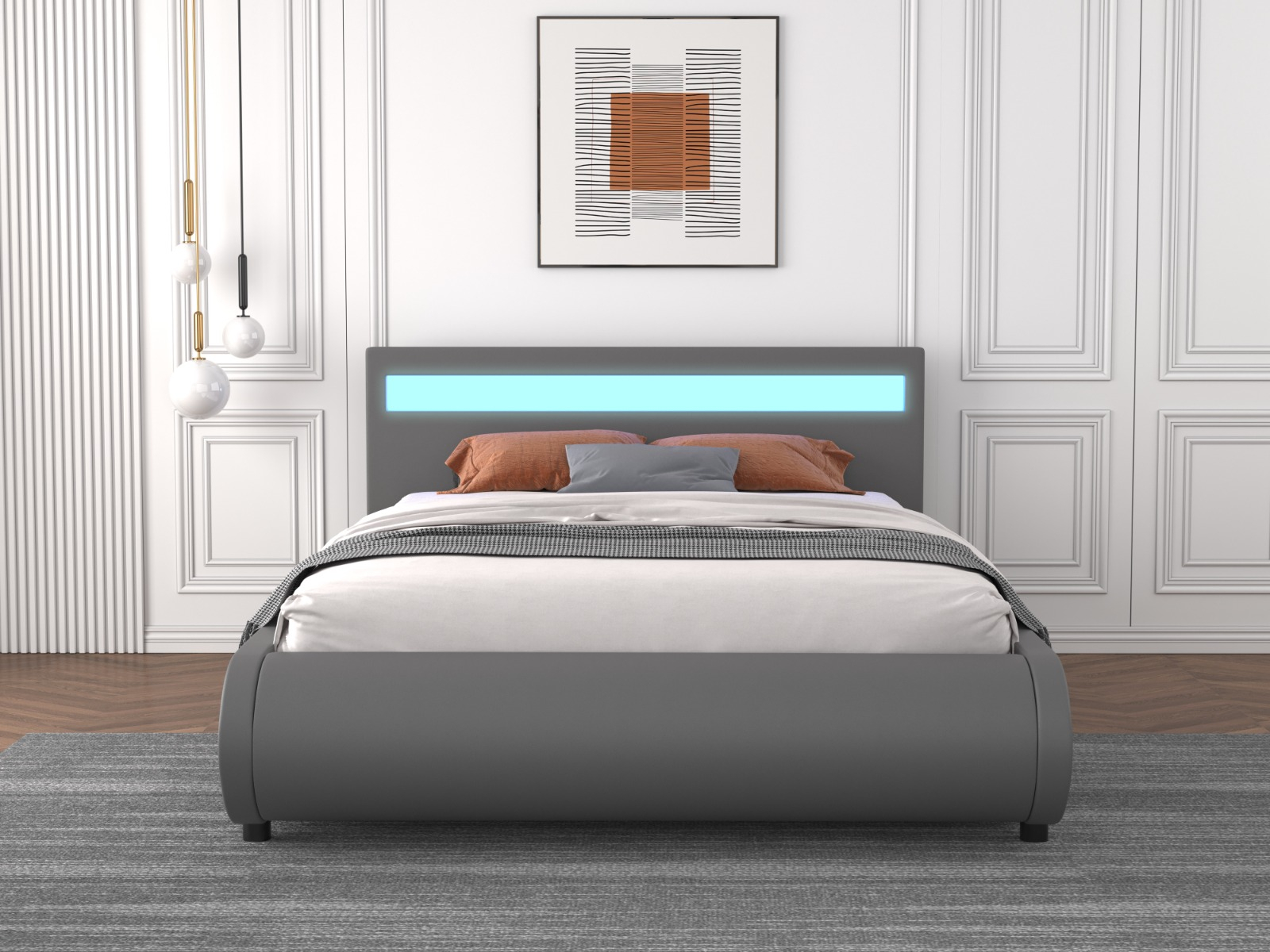 Pat A01 Tapitat Piele Ecologica 160x200cm, cu iluminare LED integrata, Gri, Saltea Ortopedica 20cm inclusa